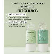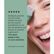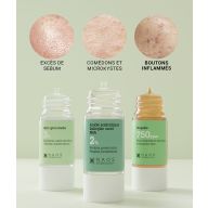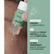 Premere la base del flacone e applicare le seguenti quantità direttamente sulla pelle del viso: - 1 goccia in caso di imperfezione isolata, - o 2 gocce per ogni area interessata (fronte, naso). Può anche essere applicato localmente su altre zone del corpo interessate (schiena, décolleté, ecc.).