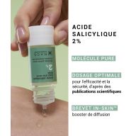 Salicylic Acid’s blemish-limiting action (comedolytic and keratolytic action) has been documented in the scientific literature for effective doses of 2%. It is also Europe’s maximum regulated dose for leave-on cosmetic products.
